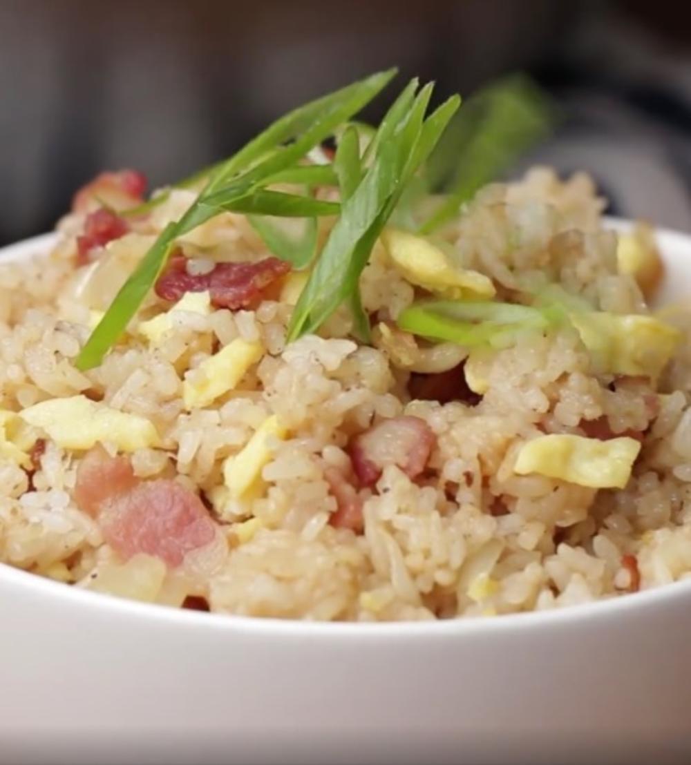 Propržite kuvani pirinač pa dodajte luk, so biber i soja sos. na kraju Dodajte jaja i slaninu.