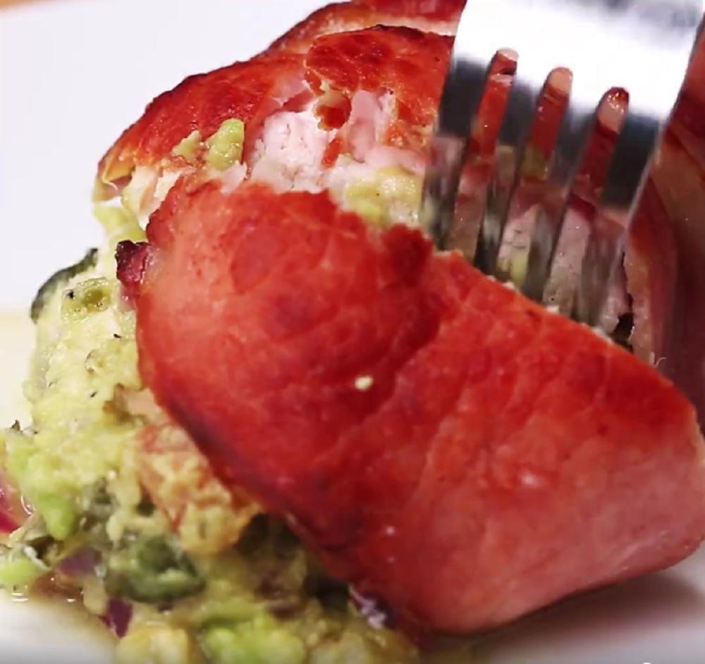 Posolite i pobiberite pileće meso, isecite ga tanko. U sredinu svakog parčeta stavite po kašuku Gvakamoli sosa. I čvrsto umotajte da se ne odvije prilikom pečenja. Oko svakog parčeta uvijte slaninu. Pecite oko 10 minuta, dok dobije zlatnu boju.