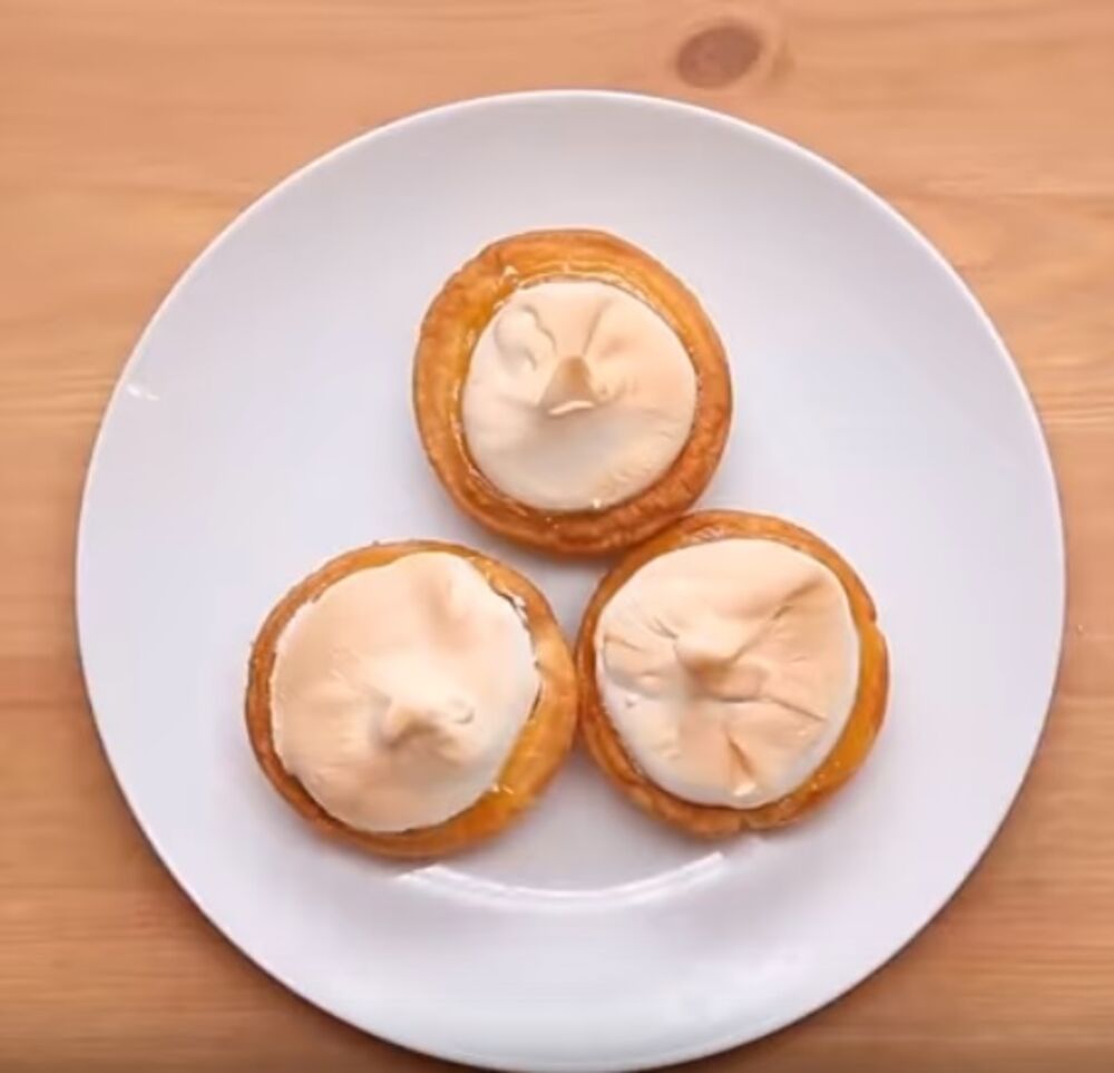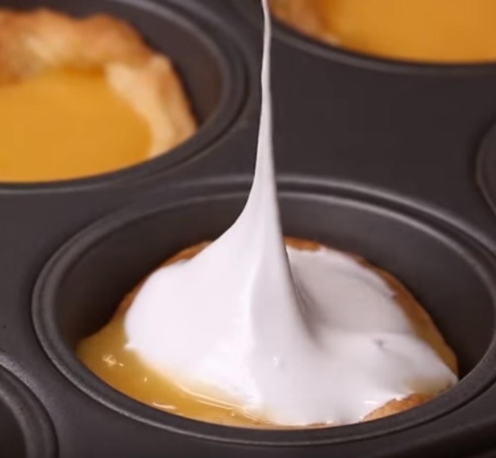 Pospite površinu brašnom, razvucite testo i isecite krugove. Ove krugove stavite u kalup za mafine i pecite oko 20 minuta da postanu braon. Na pari skuvajte izrendanu koricu od limunova, sok od limuna, šećer i pola putera, kuvajte dok se puter potpuno ne istopi. Umutite zajedno 3 jaja i jedno žumance i dodajte u kuvanu smesu. Kuvajte još 15 minuta dok se sve dobro skuva, pa smesu ostavite najmanje 3 sata u frižideru da se ohladi.
