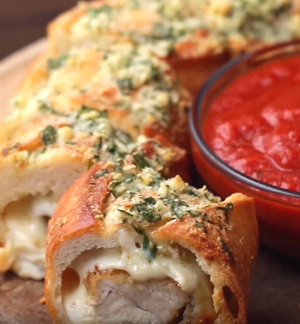 Isecite hleb na četvrtine, i izvadite sredinu. U svako parče hleba ubacite 2 parčeta mocarele i parče piletine. Iseckajte hleb na parčiće veličine koja vam odgovara pa premažite puterom od belog luka. Punjeni hleb stavite u foliju i tako pecite oko 20 minuta.