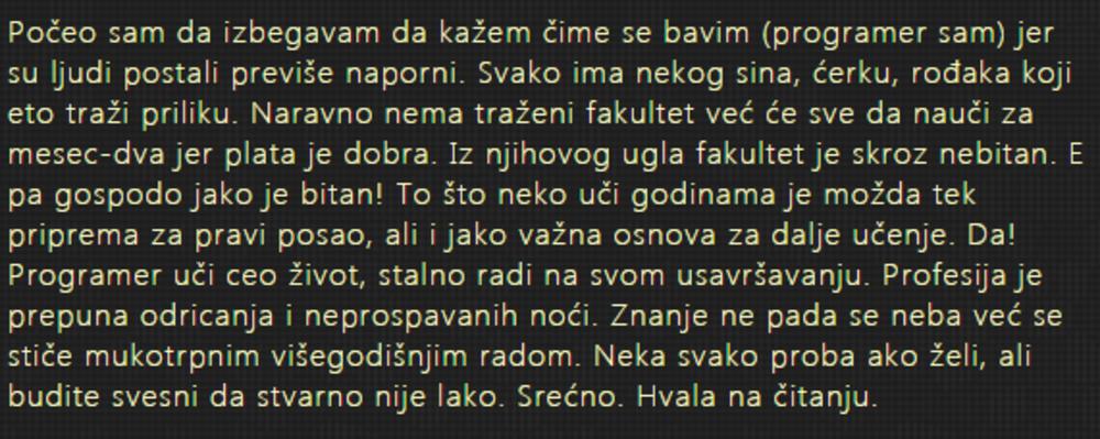 ''Počeo sam da izbegavam da kažem čime se bavim (programer sam) jer su ljudi postali previše naporni. Svako ima nekog sina, ćerku, rođaka koji eto traži priliku. Naravno nema traženi fakultet već će sve da nauči za mesec-dva jer plata je dobra. Iz njihovog ugla fakultet je skroz nebitan. E pa gospodo jako je bitan! To što neko uči godinama je možda tek priprema za pravi posao, ali i jako važna osnova za dalje učenje. Da! Programer uči ceo život, stalno radi na svom usavršavanju. Profesija je prepuna odricanja i neprospavanih noći. Znanje ne pada se neba već se stiče mukotrpnim višegodišnjim radom. Neka svako proba ako želi, ali budite svesni da stvarno nije lako. Srećno. Hvala na čitanju''.