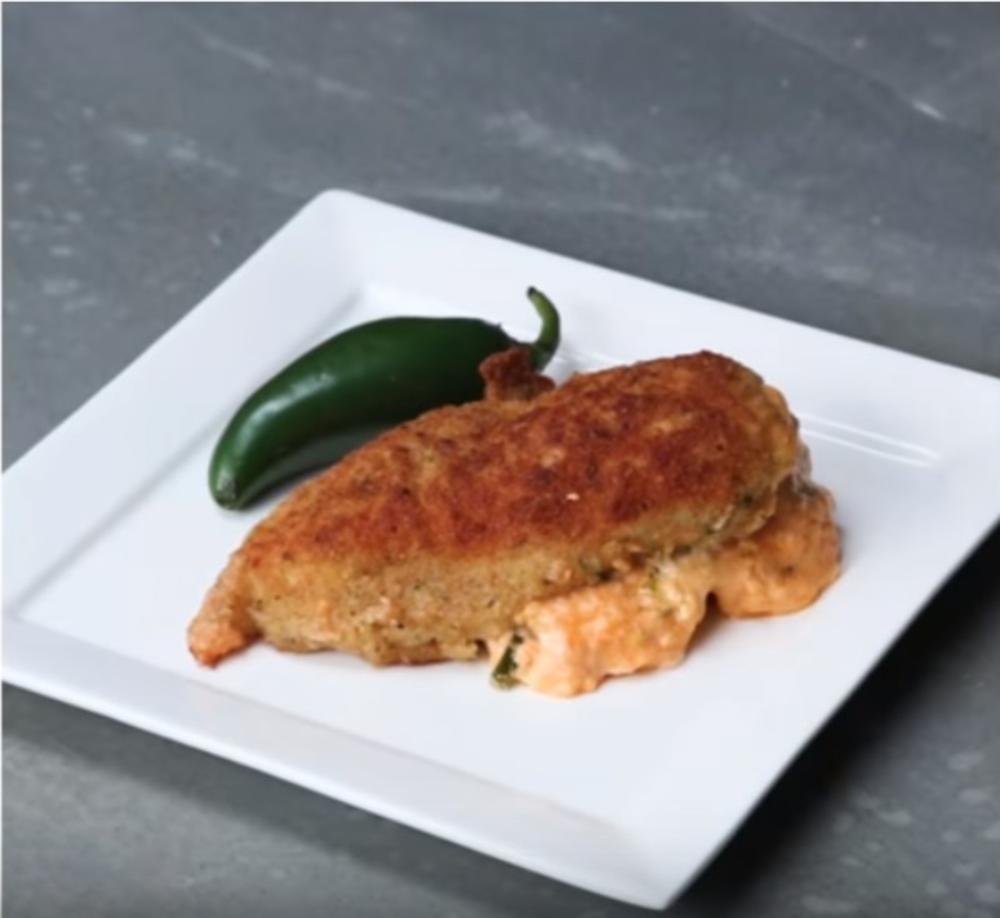 1 halapenjo ili ljuta paprika 50 g krem sira ½ šolje čedar sira 3 pileće belo meso So 2 šolje brašna 2 jaja 2 šolje mrvica 1 ulja