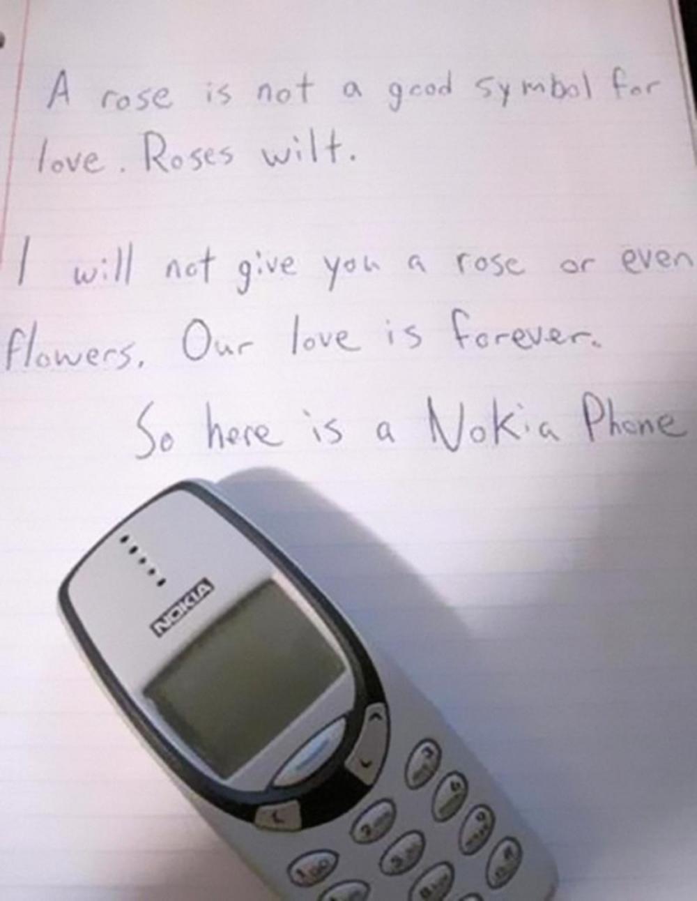 - Ruže nisu simbol ljubavi jer venu. Zato ti neću pokloniti ruže niti bilo kakvo cveće, jer je naša ljubav večna. Pa evo ti onda jedna Nokia.