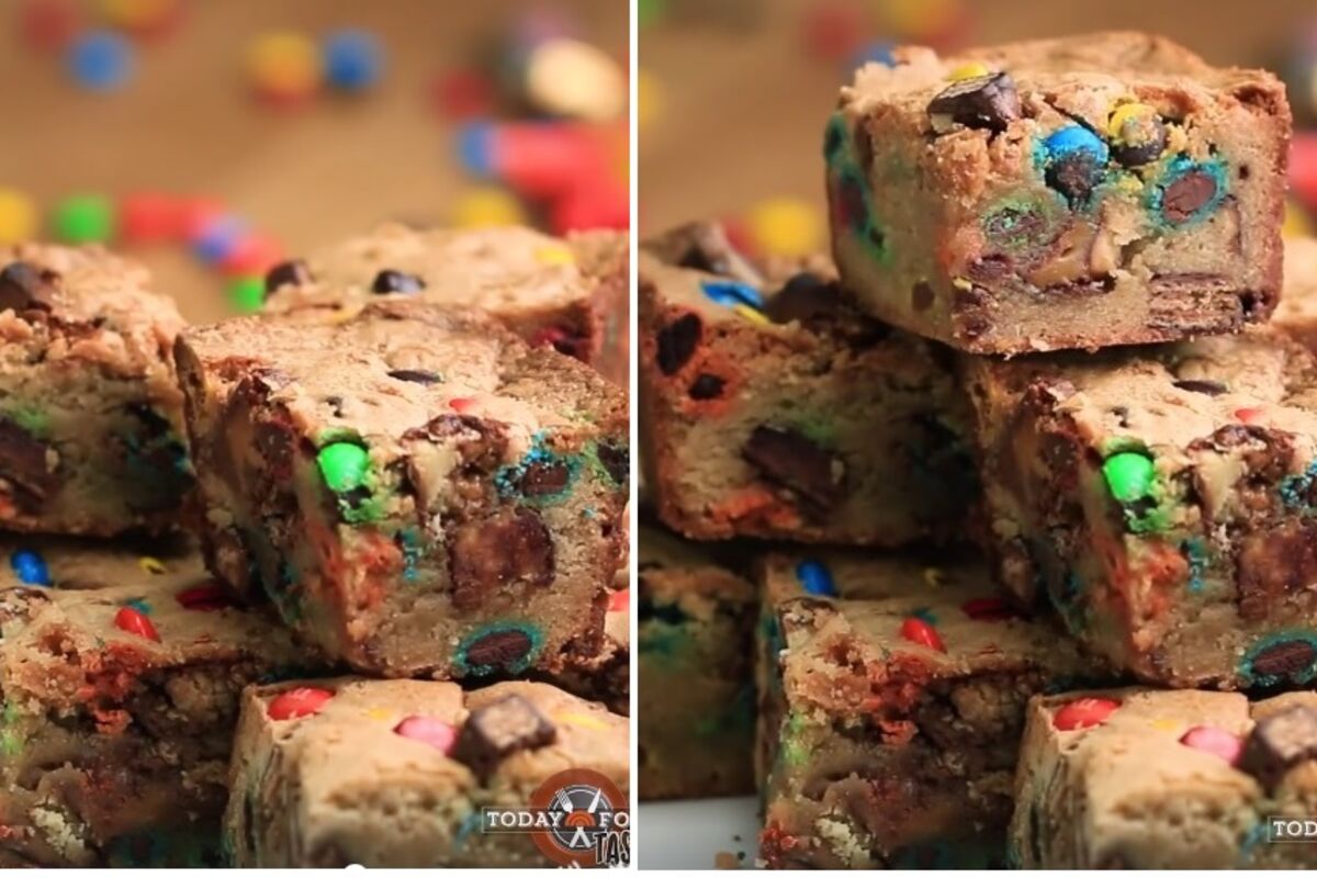 Priprema: Iseckajte slatkiše i u činiji, pomešajte sa šećerom i otopljenim puterom, pa mešajte dok se ne izjednači. Umutite jaja i vanilu, pa onda so i brašno. Sve pomešajte, sipajte u pleh i pecite 50 minuta.