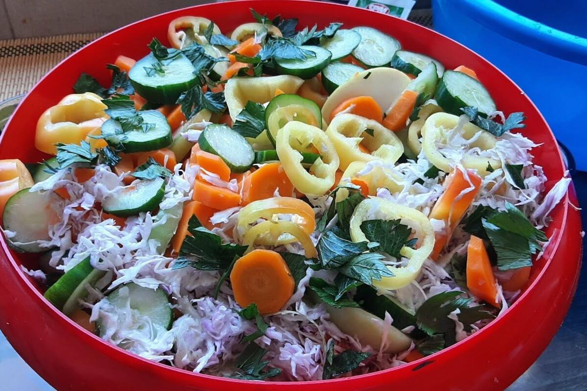 Svo povrće oprati i iseći na kolutove, a kupus na tanke rezance. Šargarepu malo blanširati ( oko 5 minuta), ohladiti pa i nju iseći na krugove. Dodati biber, slačicu, celerov list. Sipati vodu, dodati sirće, so i šećer i dobro izmešati. Preliti preko salate i dobro izmešati. Pokriti, pa svaka 2-3 sata izmešati. Ostaviti preko noći i sutra sipati u tegle.