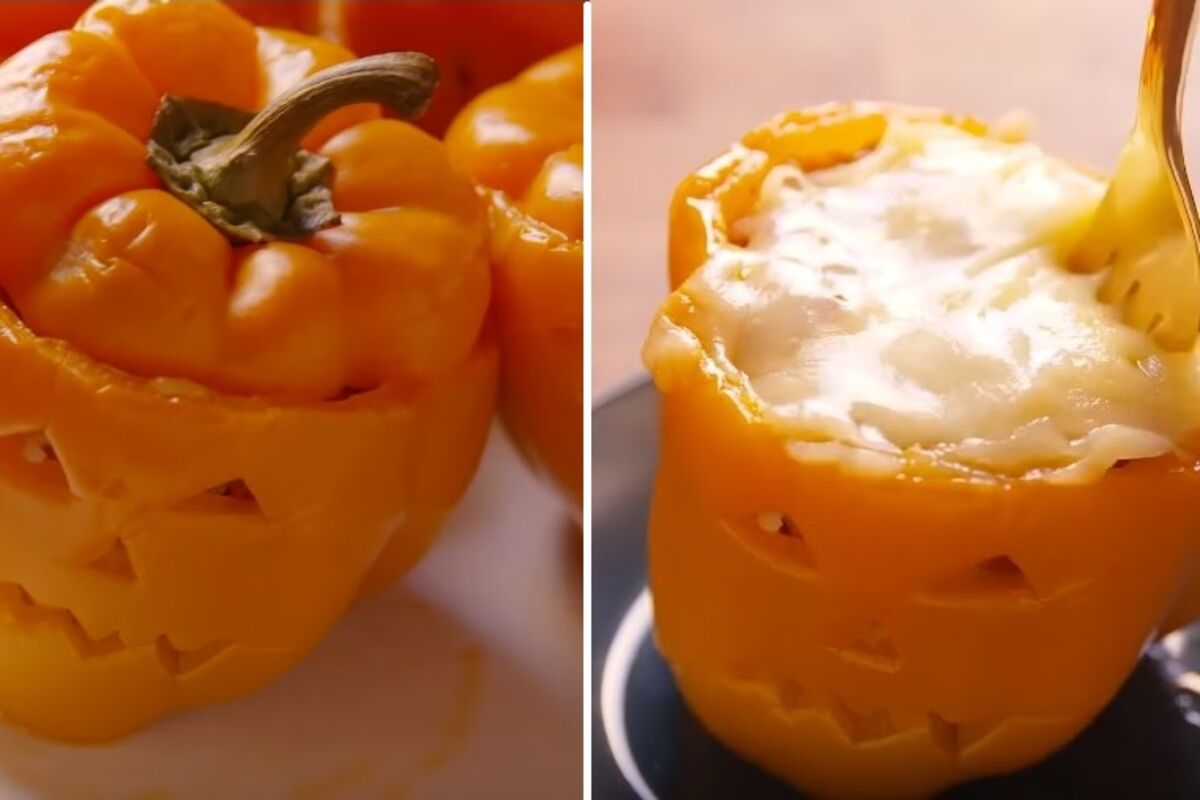 Skinite poklopac i izvadite semenke na svakoj paprici. Po želji možete izdubiti lice na svakoj paprici ako ih pripremate za halloween. Svaku papriku unutra poprskajte sa malo ulja, soli i bibera, pa ih poređajte u posudu za pečenje, jednu do druge da mogu lepo da stoje.