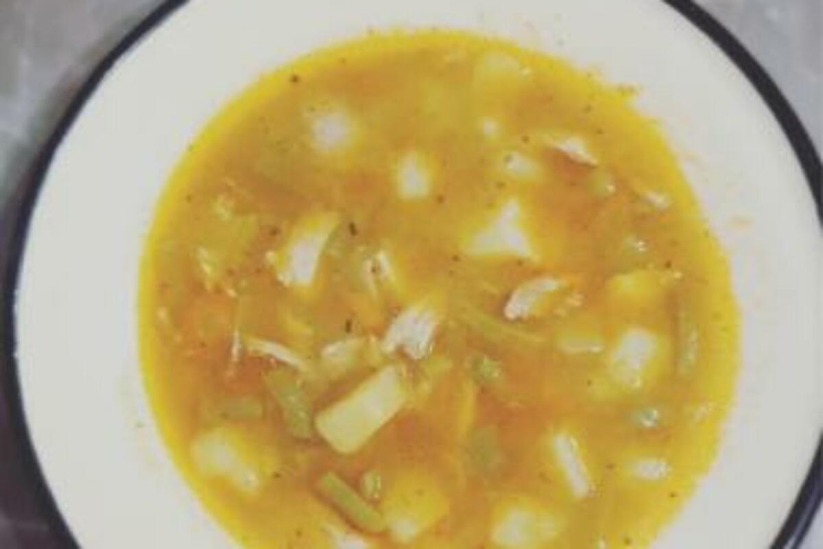 Na ulju izdinstajte sitno iseckano belo meso, izvadite ga iz šerpe pa dodajte iseckan crni luk. Kratko dinstajte, pa dodajte iseckan beli luk. Par sekundi još pržite pa dodajte isečen krompir, vodu da prekrije. Kuvajte dok krompir ne omekša. Ispasirajte viljuškom ili štapnim mikserom, vratite meso u čorbu, začinite i dodajte peršunovo lišće i još vode (koliko volite da bude gusto). Kuvajte oko 2 minuta pa dodajte rezance. Prijatno!