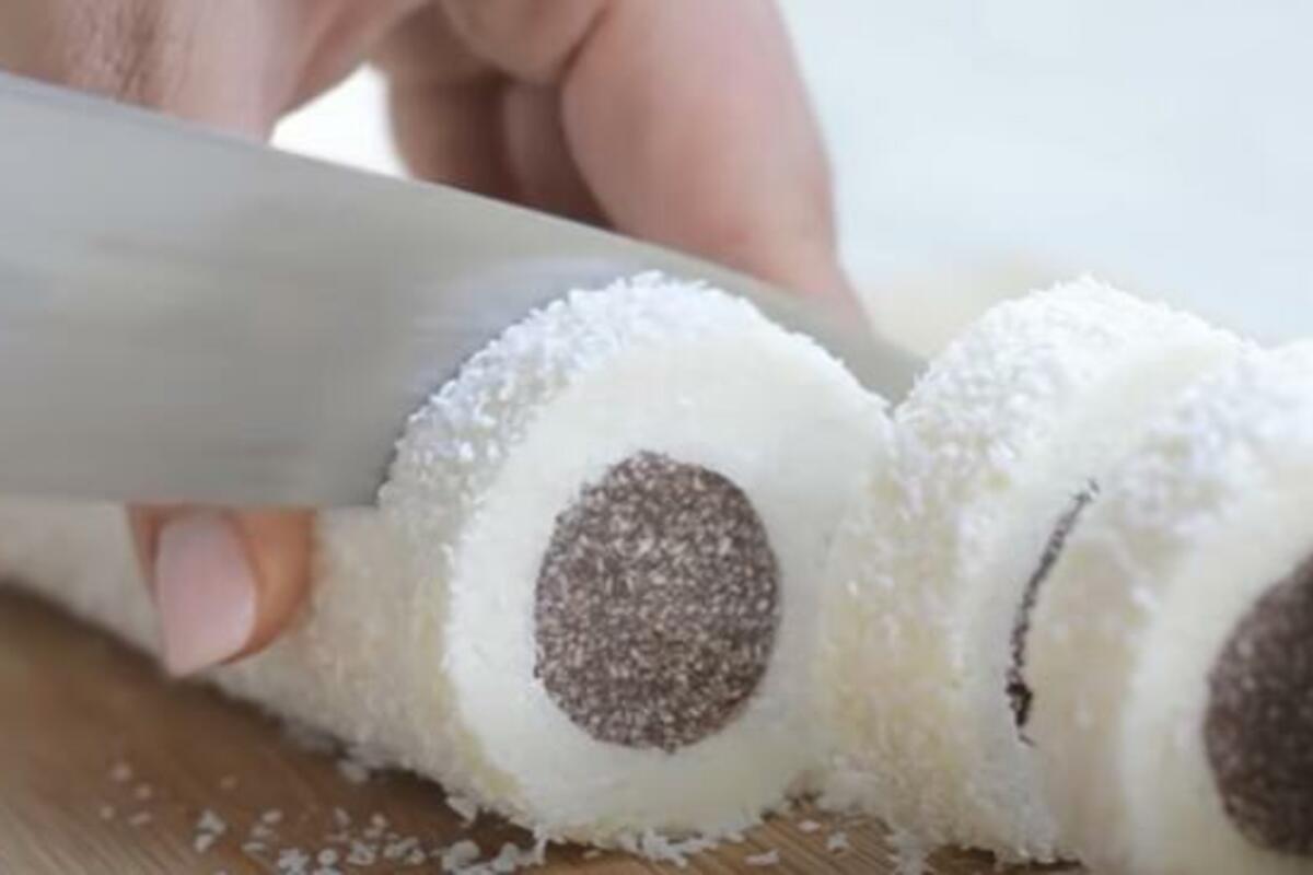Kad istekne 30 minuta, odmotajte kolač iz folije i uvaljajte ga u kokosovo brašno, i isecite na jednake komade.