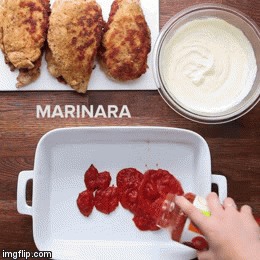 Rernu zagrejte na 180 stepeni. Isecite piletinu na pola, posolite i pobiberite, uvaljajte je u brašno, jaja i hlebne mrvice. Ispržite piletine na malo ulja oko 4 minuta sa obe strane. U činijici umutite jaje i rikotu i ostavite sa strane.