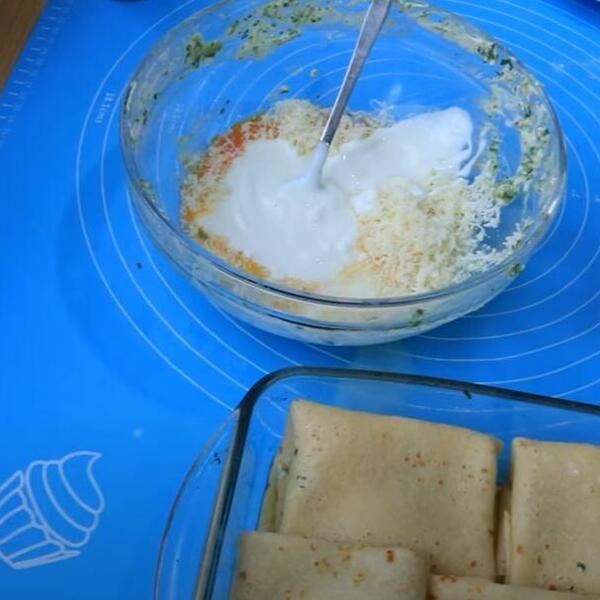 U činiju razbiti 2 jaja dodati 45 mil mleka soli brašna i malo ulja, izmutiti žicom ređe testo. Ispeći palačinke. Meni je za tepsiju 35x25 cm bilo potrebno 8 većih palačinki. Sir izmrviti, dodati 1 jaje spanać, kačkavalj i pavlaku i sve dobro izjednačiti. Svaku palačinku filovati sa 2 kašike nadeva.