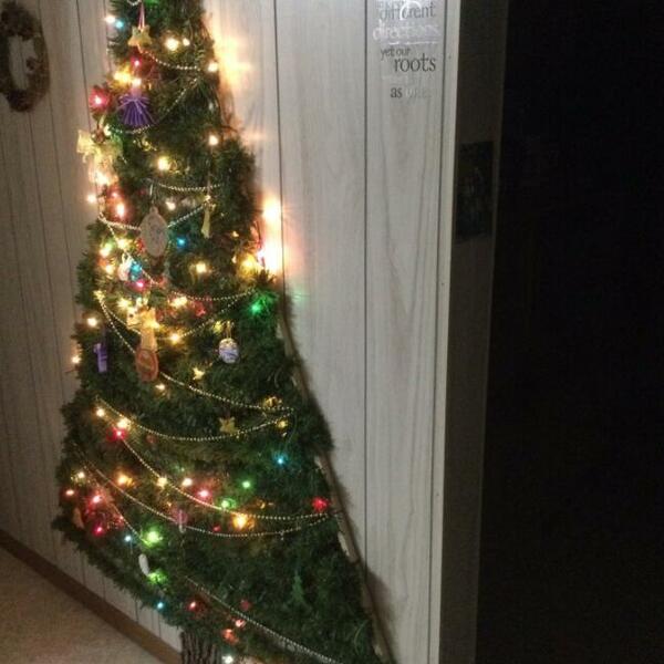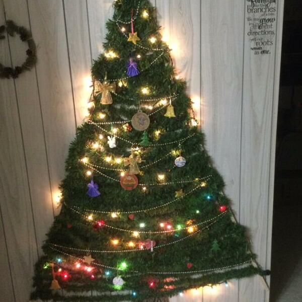 Potrebne su vam girlande koje ćete moći da zalepite bilo tako što ćete napraviti pun trougao, bilo tako što ćete napraviti stilizovanu šaru. Ovakva jelka vam omogućava i da je okitite lakšim ukrasima i lampicama (što je malo nezgodnije ako je na vratima, a vama treba utičnica, pa biste morali da potražite lampice koje rade na bateriju).
