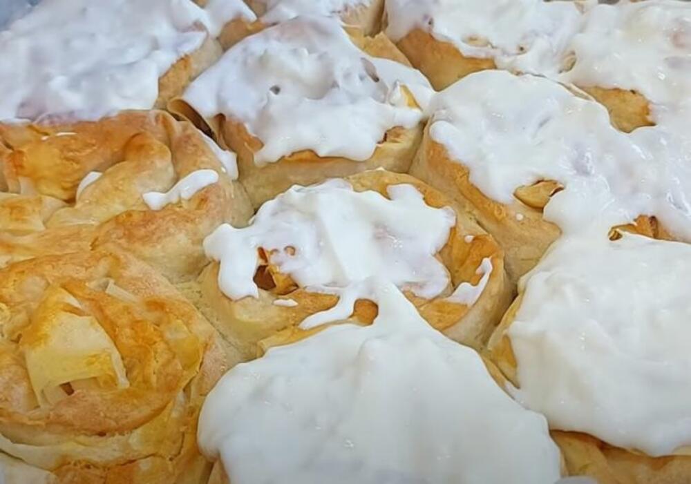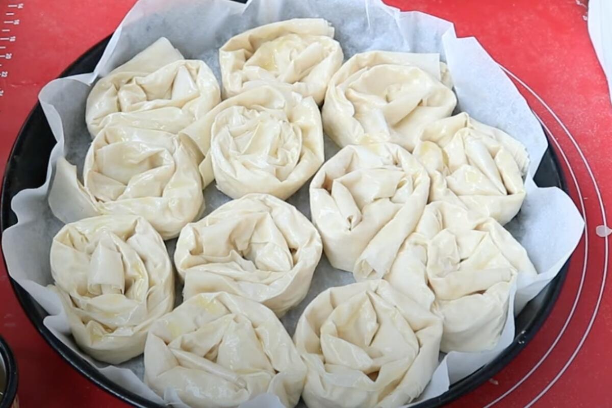 U činiju staviti izmrvljen kvasac, dodati mlaku vodu, izmešati (možete staviti i 1 kašičicu šećera). Dodati ulje i brašno. Izmešati da ne bude grudvica (treba biti kao za palačinke). Svaku koru preliti sa dve manje kutlače preliva i razvući po celoj kori. Uviti u rolnicu. Rolnicu uviti u krug, kao malu pitu. Ređati u podmazan pleh ili obložen pek papirom.