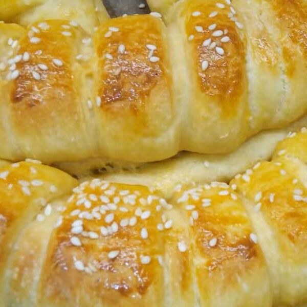 Iseći na 16 trouglova, puniti sirom i uviti u kiflice. Tako i sa ostale dve velike lopte. Kiflice pokriti da odmore 20 minuta pa ih premazati žumancetom, i posuti susamom. Peći na 200 stepeni 30-35 minuta da lepo porumene.