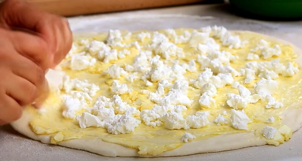 Svaki deo razvucite i filujte umućenim maslacem sa jejetom. Odozgo stavite sir ili šta želite, umotajte i oštrim nožem secite ukoso da dobijete trouglove.