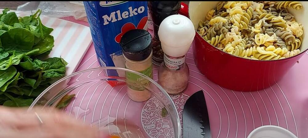 300 gr testenine 200 gr spanaća 200 ml jogurta 300 ml mleka 2-4 jaja 50 gr kačkavalja 50 gr sira 50 ml maslinovog ulja so, biber granule belog luka