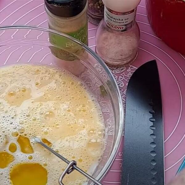 U činiji razbiti i umutiti jaja, dodati ulje, jogurt, mleko i jednu kašiku rendanog kačkavalja. Posoliti i pobiberiti.