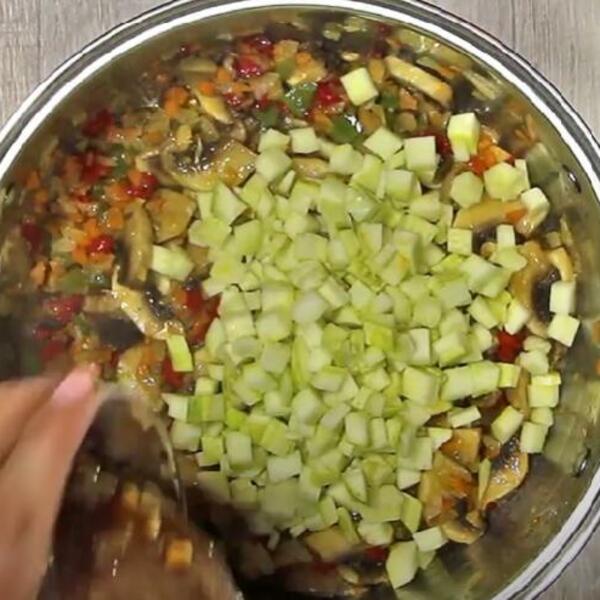 Čim omekšaju dodajte masline, tikvicu isečenu na sitno i začinite sa malo soli, a možete da dodate i biber po ukusu. Dodajte paradajz pire, a nakon što povrće omekša, dodajte pirinač i promešajte.