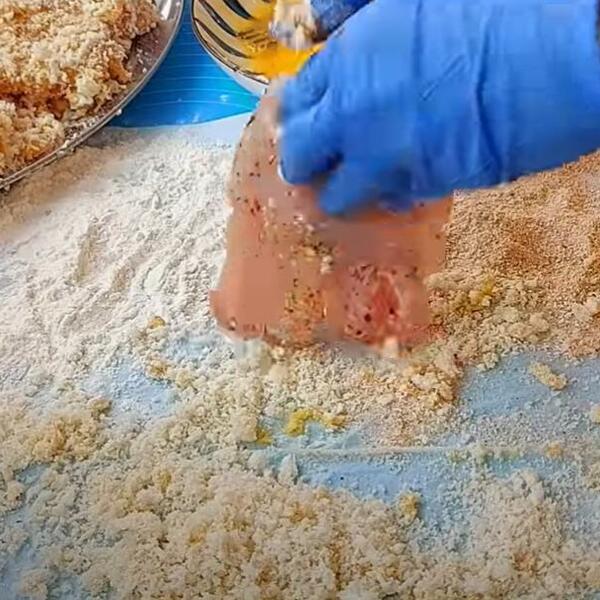 1 par pilećih šnicli 3 jaja mrvice iz kese mrvice svežeg hleba so, biber ulje začini