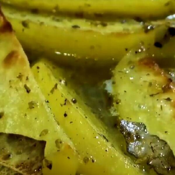 Zagrejte rernu na 250 °C. Operite, oljuštite i isecite krompir kao na slici i poređajte ga u tepsiju. Krompir ne sme da bude jedan preko drugog. Prokuvajte vodu (nešto više od jedne čaše je dovoljno da prekrije krompir) i u nju rastvorite so (treba dosta soli, ali oprezno). Tom vodom prekrijte krompir koji ste poređali u tepsiju. Dodajte ulje, pospite krompir origanom, stavite beli luk, lovor i biber. Sok od limuna ne dodajemo na početku jer će se od njega krompir stvrdnuti! Ubacite krompir u zagrejanu rernu na 250 °C. Čim krompir krene da rumeni tj. čim dobije boju i ispari sva voda tj. ostane samo ulje, smanjite temperaturu na 200°C i pecite sve dok krompir ne omekša, ukupno oko 50 minuta, sve zavisi od rerne i krompira. Negde pred kraj pečenja izvadite tepsiju i prelijte krompir sokom od sveže ceđenog limuna, vratite par minuta u rernu, izvadite i služite.