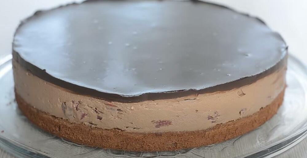 Na kraju prelijte čokoladnom glazurom, koja se pravi tako što otopite čokoladu i slatku pavlaku. Stavite u frižider da se stegne i onda ukrasite rednanom čokoladom i šećerom u prahu.