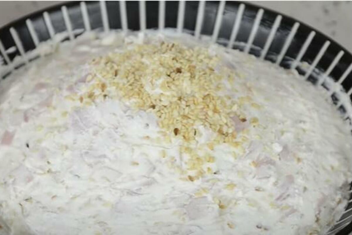 Belo meso stavite da se kuva zajedno sa šargarepom, celerom, paškanatom i krompirom. Kada bude gotovo, procedite, potom piletinu iseckajte na trakice i stavite u činiju u kojoj ćete sjediniti sastojke. Šargarepu, celer i paškanat izgnječite, a krompir isecite na kocke. Susam ispecite, pa ga dodajte u piletinu i povrće, pa sve začinite po ukusu. Ubacite kukuruz i naseckane krastavčice. Jaja očistite pa ih isecite što sitnije i dodajte u činiju. Pomešajte pavlaku i majonez da dobijete glatku smesu, sipajte u činiju i sve dobro promešajte. Dekorišite po želji sa malo seckanog peršuna i susamom.