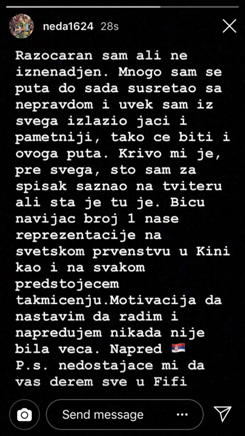 - Razočaran sam, ali ne iznenađen. Mnogo sam se puta do sada susretao sa nepravdom i uvek sam iz svega izlazio jači i pametniji, tako će biti i ovoga puta. Krivo mi je, pre svega, što sam za spisak saznao na Tviteru. Biću navijač vroj 1 naše reprezentacije na Svetskom prvenstvu u Kini, kao i na svakom predstojećem takmičenju. Motivacija da nastavim da radim i napredujem nikada nije bila veća. Napred Srbija - napisao je Nemanja Nedović.