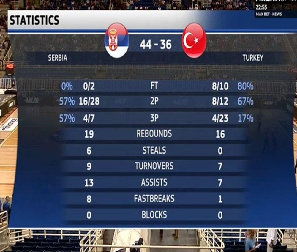 DRUGA ČETVRTINA: Opet je Srbija dobro otvorila četvrtinu, a ponovo je sjajno funkcionsiala igra u tranziciji. Marko Gudurić je dva puta ukrao loptu i elegantno položio. Usledila je eksplozija Bogdanovića, koji je vezao dve trojke i pokazao da je lider ove selekcije. Ispratio ga je i Bjelica, koji je pogodio trojku i ponovo uvećao prednsot Srbije.Sa druge strane Turci su tokom celog poluvremena imali problem sa šute. Bogdanović je upisao 12, Jokić ga je pratio sa 8, a odličan je bio i Birčević sa 7. Srbija vodi sa 44:36.