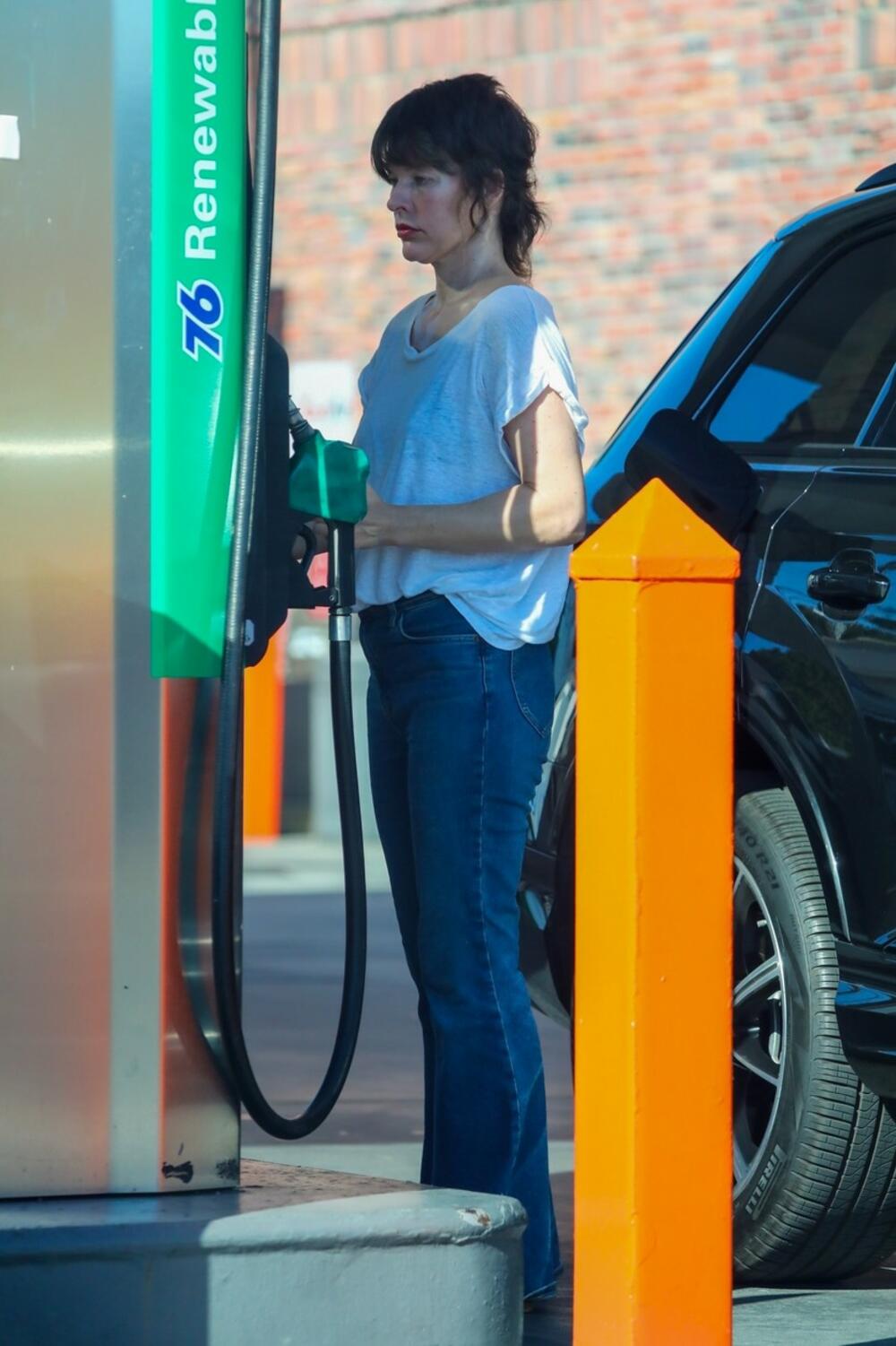 47-godišnja glumica i manekenka obukla je tanku belu majicu ispod koje je nosila plavi brus i svi su je gledali dok je sipala gorivo na benzinskoj pumpi. Mila je svoj izgled upotpunila braon sandalama i farmerkama, a nije ni imala previše šminke na licu.