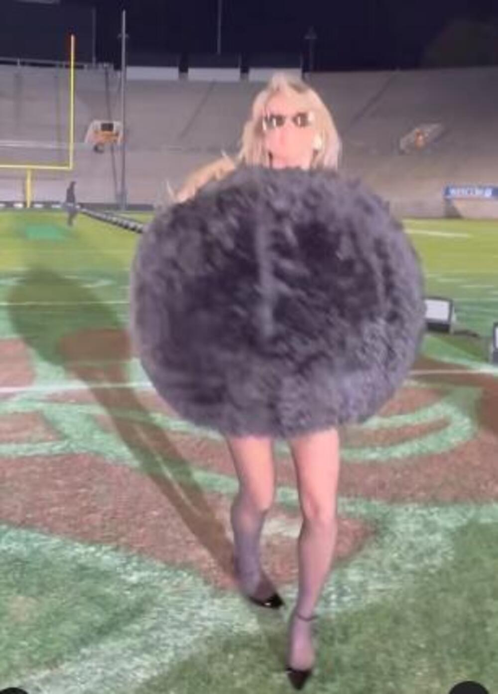 Pedesetogodišnja manekenka i članica žirija takmičenja "America's Got Talent" imala je veoma jedinstven način da predstavi svoje novo muzičko izdanje, dok je plesala duž linije u sredini terena u sivom pahuljastom pomponu. Hajdi je za tu priliku skinula pantalone, otkrivajući svoje duge vitke noge u paru crnih štikli.