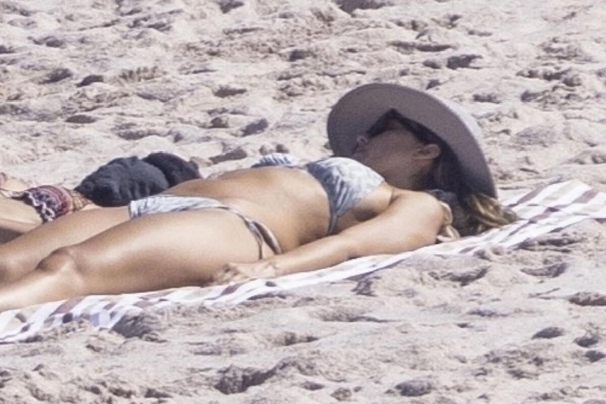 Glumica je otkrila svoj zategnuti stomak i noge u minijaturnom plavo-belom bikiniju s dezenom dok se sunčala s ćerkom Onor (16), a svi pogledi bili su upereni u njih.