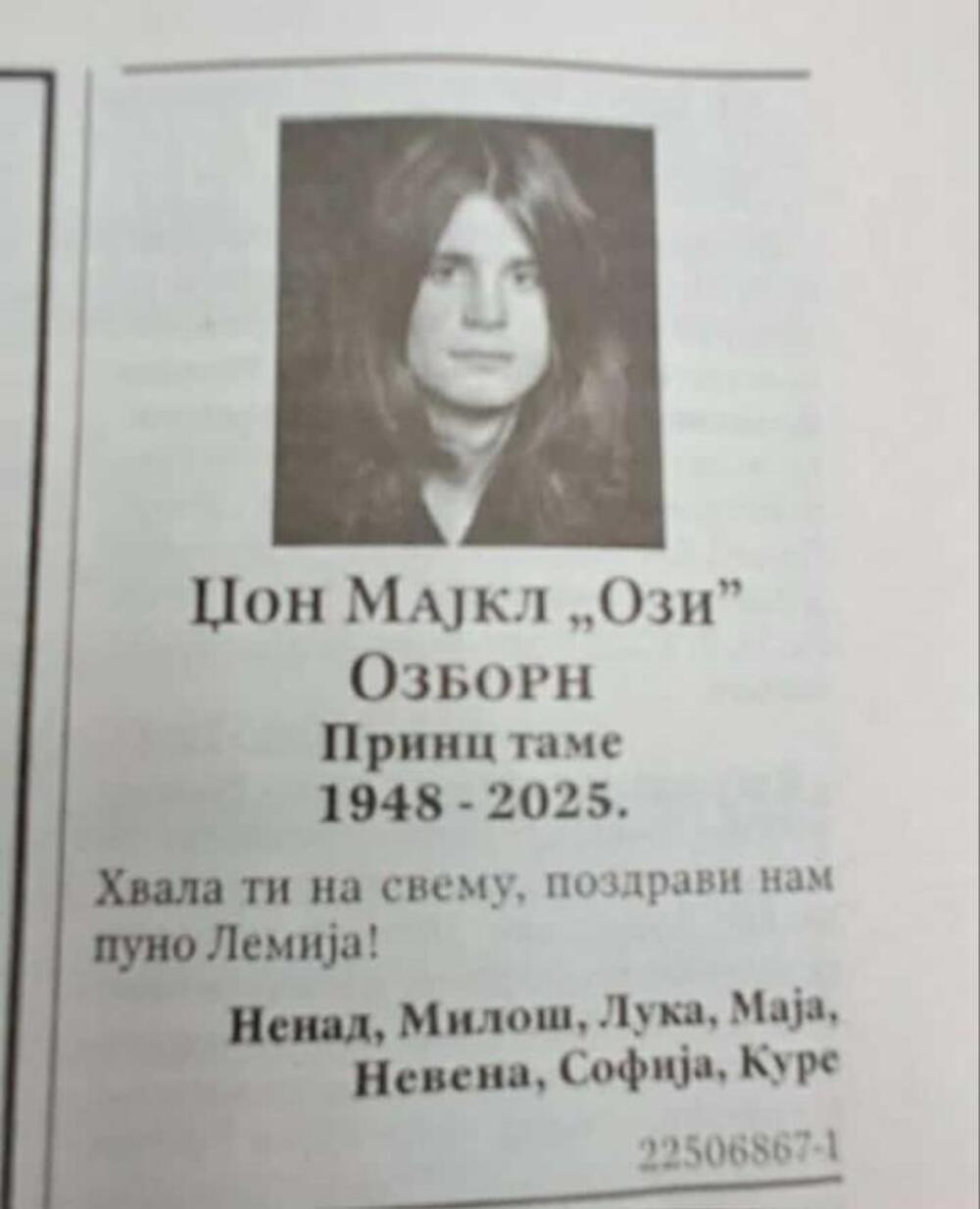 "Džon Majkl "Ozi" Ozborn, Princ tame, 1948-2025. Hvala ti na svemu, pozdravi nam puno Lemija (Lemija Kilmistera, frontmena Motorhead-a, koji je preminuo pre nekoliko godina, prim.aut)", piše u čitulji, u potpisu Nenad, Miloš, Luka, Maja, Nevena, Sofija, Kure.