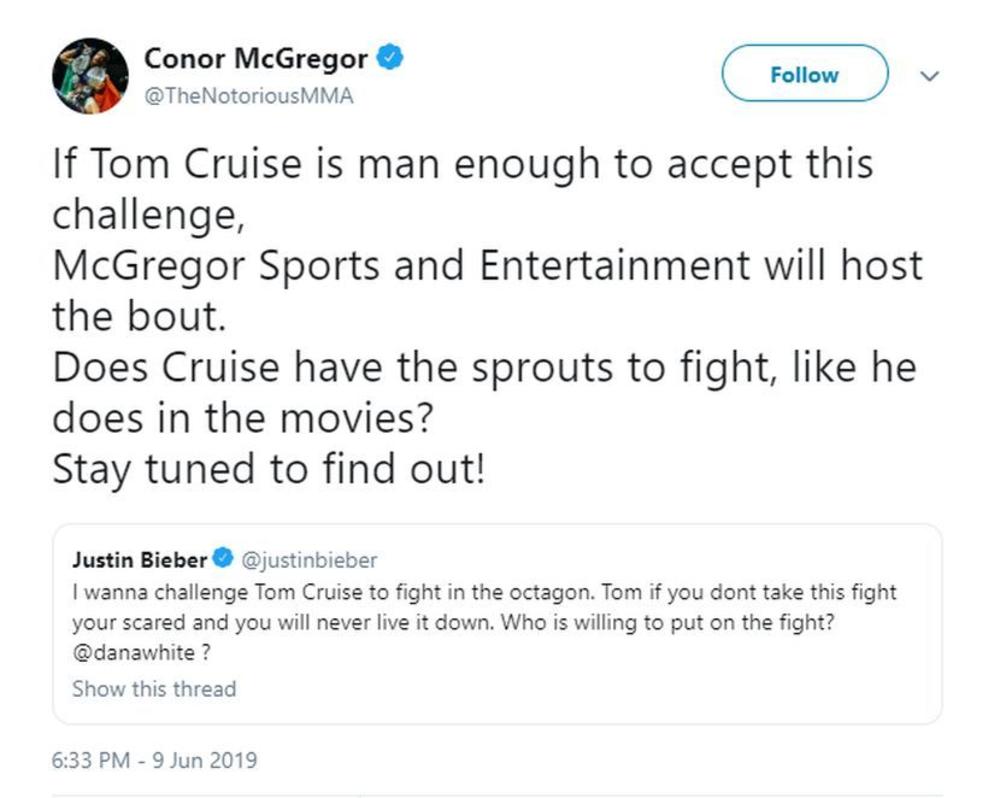 - Ako je Tom Kruz čovek da prihvati ovaj izazov, "McGregor Sports and Entertainment" (Mekgregor sportska organizacija) će organizovati ovu borbu - napisao je Mekregor.