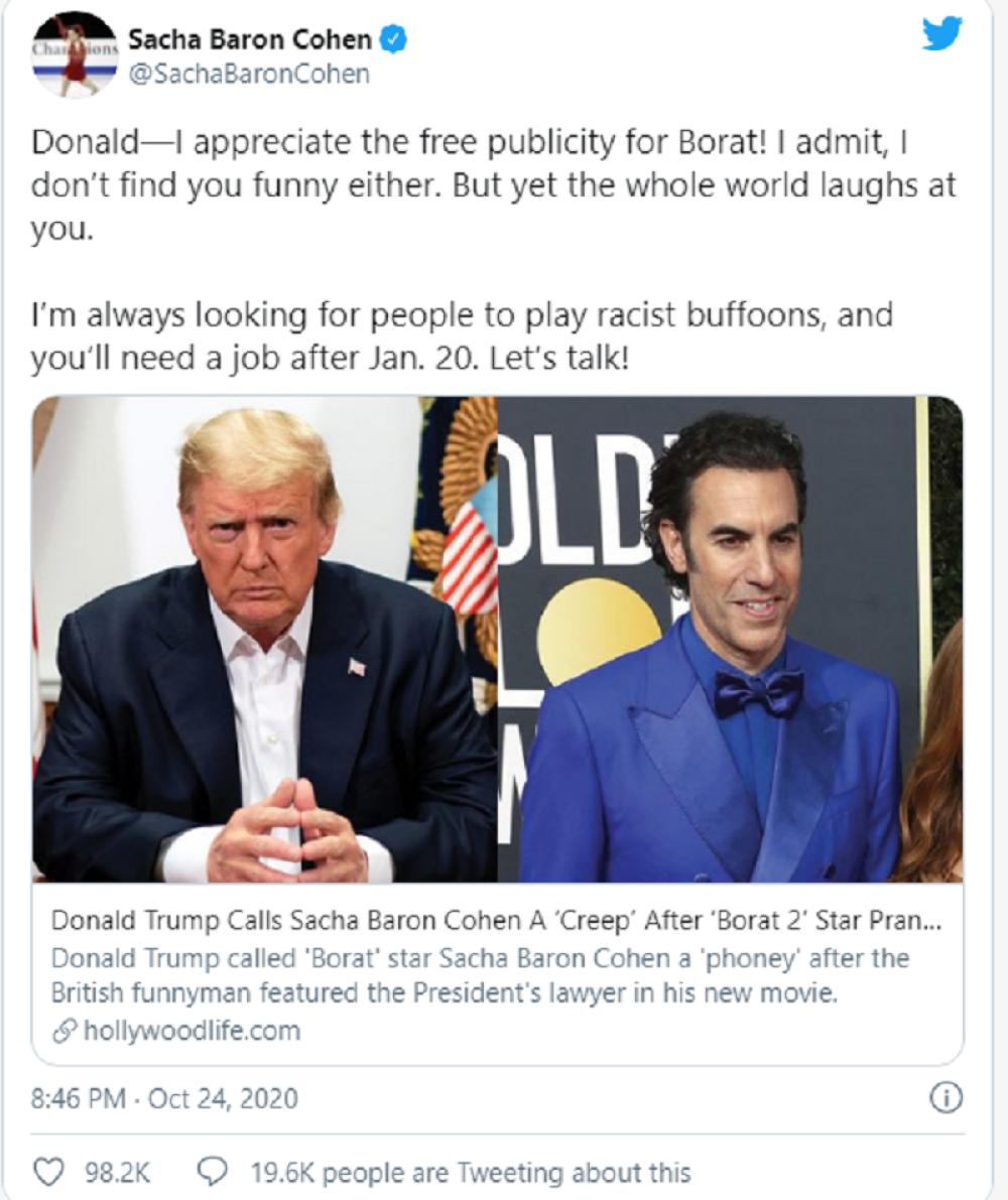 Donalde, cenim besplatnu reklamu za Borata! Priznajem, ni ti meni nisi smešan, ali ipak ti se ceo svet smeje", poručio mu je Koen. "Uvek tražim rasističke lakrdijaše, a tebi će trebati posao posle 20. januara. Razgovarajmo!" napisao je Koen.