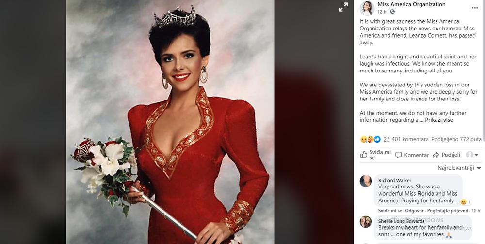 Tužnu vest potvrdili su i organizatori takmičenja Mis Amerike na Fejsbuku. "Znamo da je puno značila mnogima, uključujući i sve vas. Slomljeni smo iznenadnim gubitkom u našoj Mis Amerika porodici i izražavamo duboko žaljenje porodice i bliskim prijateljima na gubitku", napisali su.