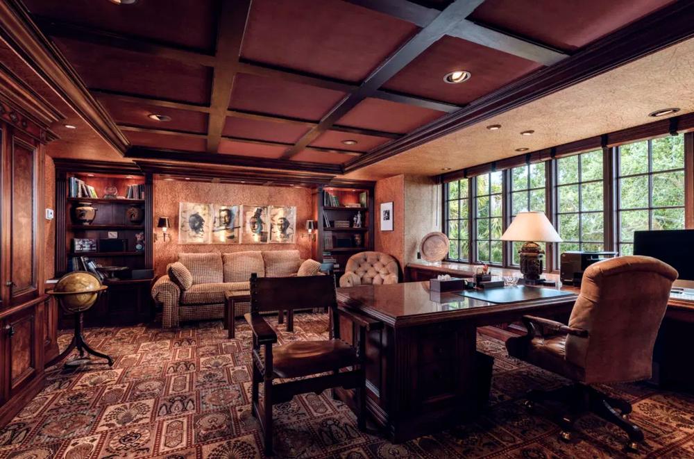 Pozadina u foajeu su dva odvojena stepeništa; jedan vodi do podzemnog donjeg nivoa, gde se nalazi privatna kancelarija i sala za konferencije, drugi vodi na sprat, gde su smeštene sve četiri spavaće sobe glavne kuće. Raskošni glavni apartman zauzima više od polovine ovog nivoa i uključuje kamin sa prostorom za sedenje, dva kupatila, posebnu prostoriju koja služi za garderober. Tu je i privatna terasa sa očaravajućim pogledom na zemljište imanja i Tihi okean.