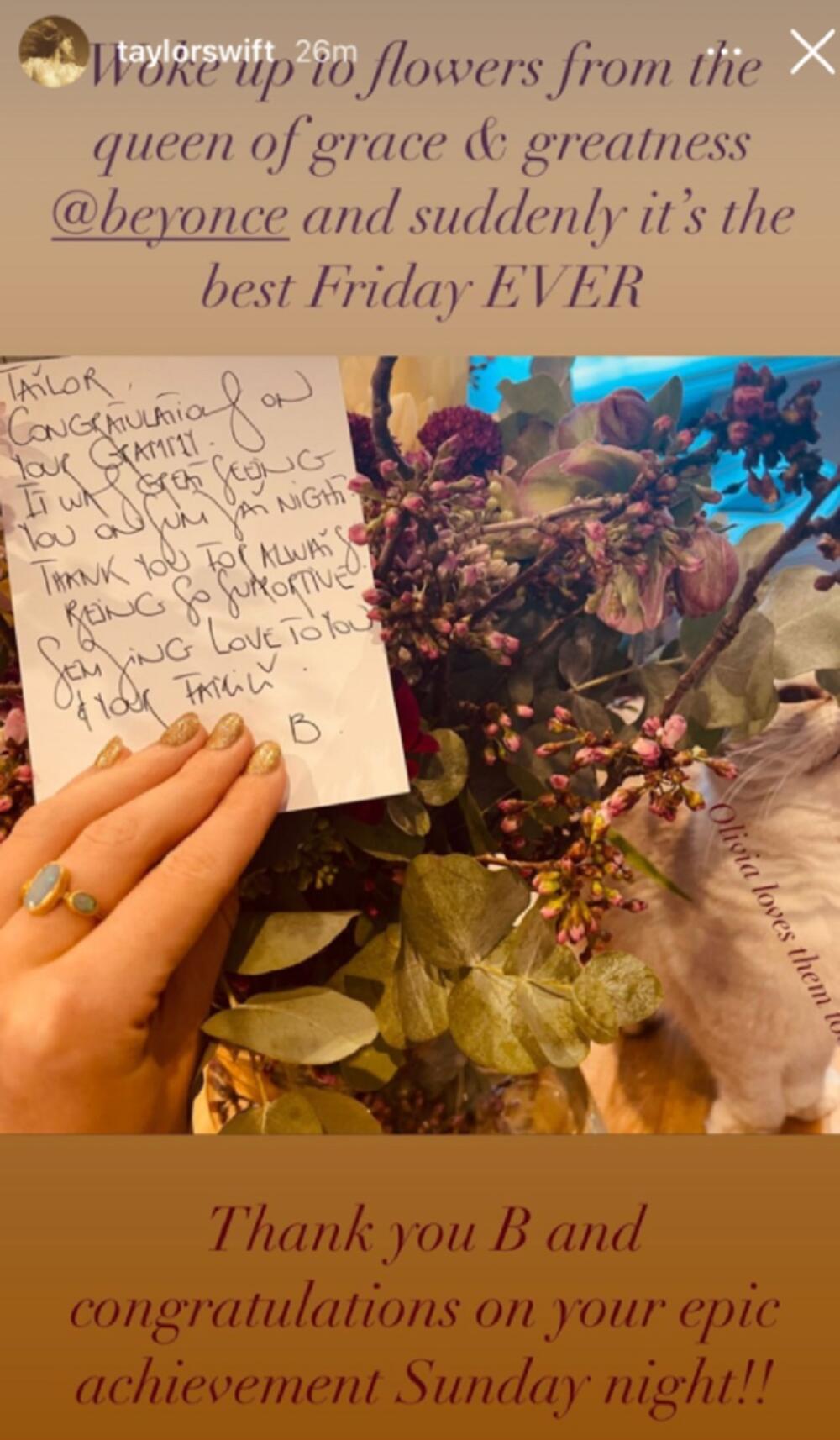 “Probudila sam se i zatekla cveće kraljice milosti i veličine Bijonse i odjednom je to najbolji petak ikad”, napisala je Tejlor uz fotografiju.