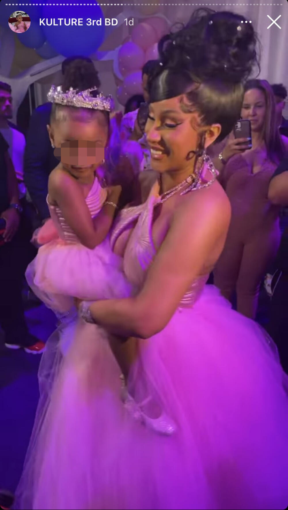 Kardi Bi je zajedno sa ćerkom dovezena u kočiji, na zabavi su se u kutijama nalazile devojke kostimirane u Diznijeve princeze, a tu je bio i celi dvorac. Zabavljali su se i odrasli koji su pred decom zaplesali „prljavi ples“.