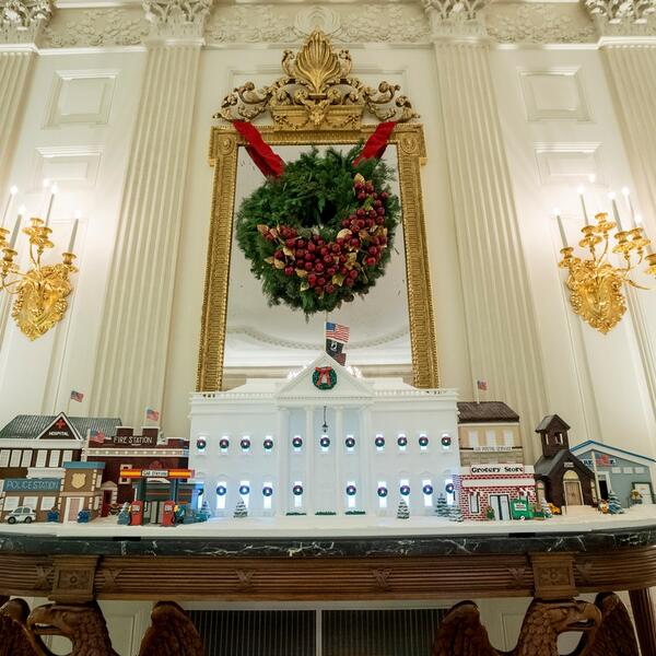 Stigao je i džinovski medenjak ‒ maketa Bele kuće, koja je ove godine u znaku borbe protiv pandemije i odaje priznanje medicinskim radnicima na prvoj liniji fronta.