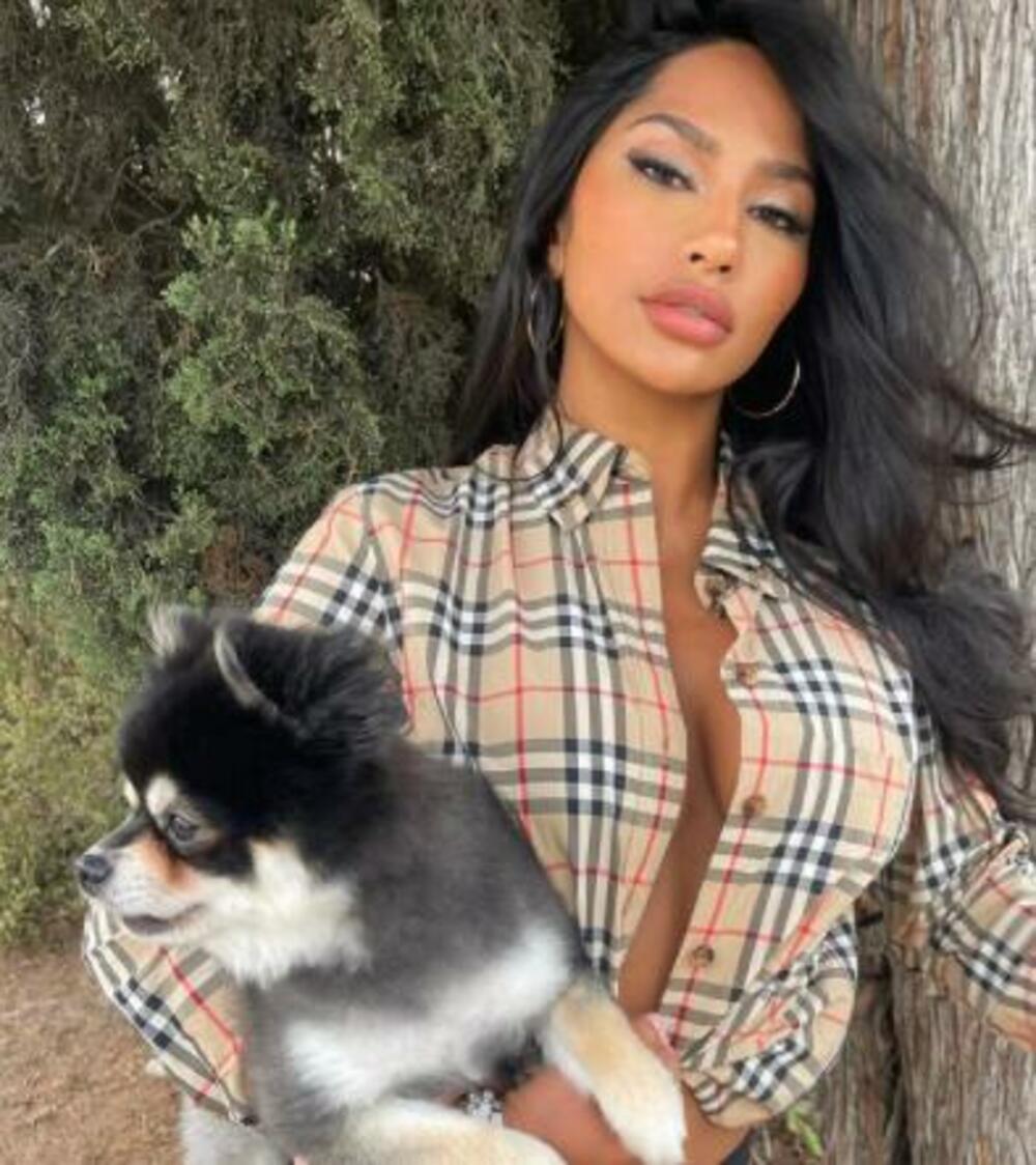 Iako je želela da ova fotografija bude slatka, budući da se fotkala sa svojom kucom, ona nije mogla bez provokacije, pa je obukla košulju koju je skroz raskopčala, a ispod nje nije imala brus, pa smo mogli da vidimo da se naziru njeni silikoni.