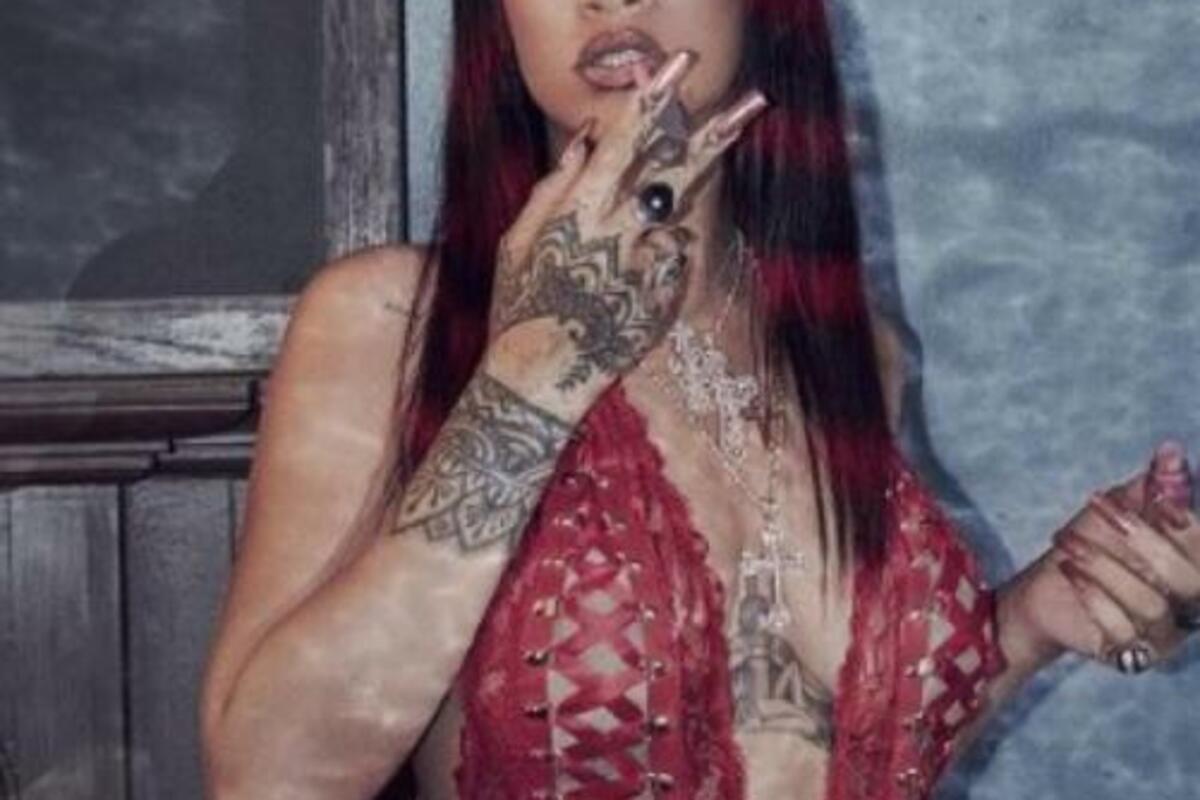 Pozirala je u crvenom trikou dubokog dekoltea i golih leđa, koji se vezuje preko grudi. Čipkasti dizajn iskombinovala je s mrežastim najlonkama iste boje. Celu ovu seksepilnu kombinaciju upotpunila je crno-crvenom frizurom.