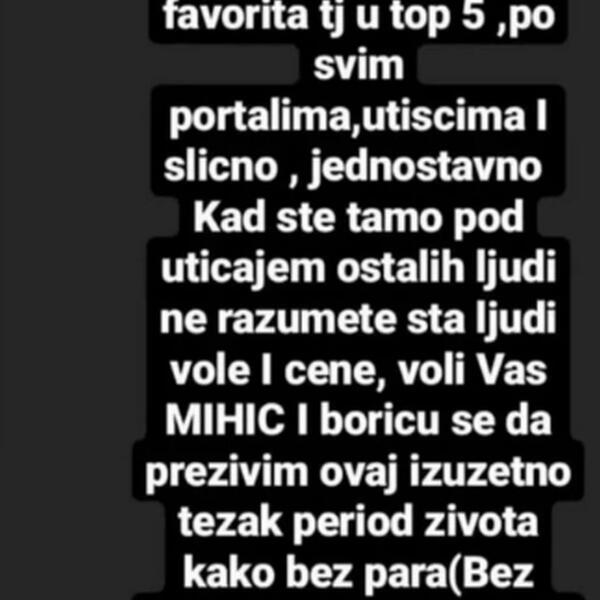 - Svestan sam da nije došlo do nepravde i mog svojevoljnog ali prinudnog izlaska da sam bio jedan od favorita tj. u top pet, po svim portalima, utiscima i slično. Jednostavno kad ste tamo tamo pod uticajem drugih ljudi ne razumete šta ljudi vole i cene, voli Vas Mihić i boriću se da preživim ovaj izuzetno težak period života kako bez para (bez honorara sa kaznom), tako i bez odeće (neće da mi vrate), ali čistog obraza do kraja.