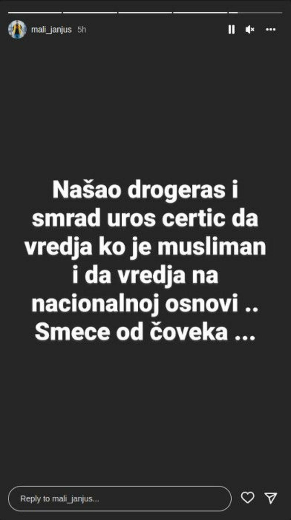 - Našao drogeraš i smrad Uroš Ćertić da vređa ko je musliman i da vređa na nacionalnoj osnovi. Smeće od čoveka - napisao je Janjuš, koji nije krio koliko ga je ovakvo ponašanje izbacilo iz takta.