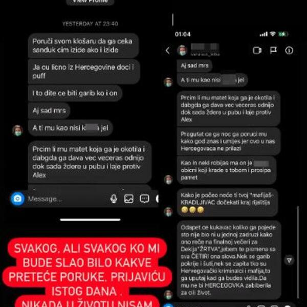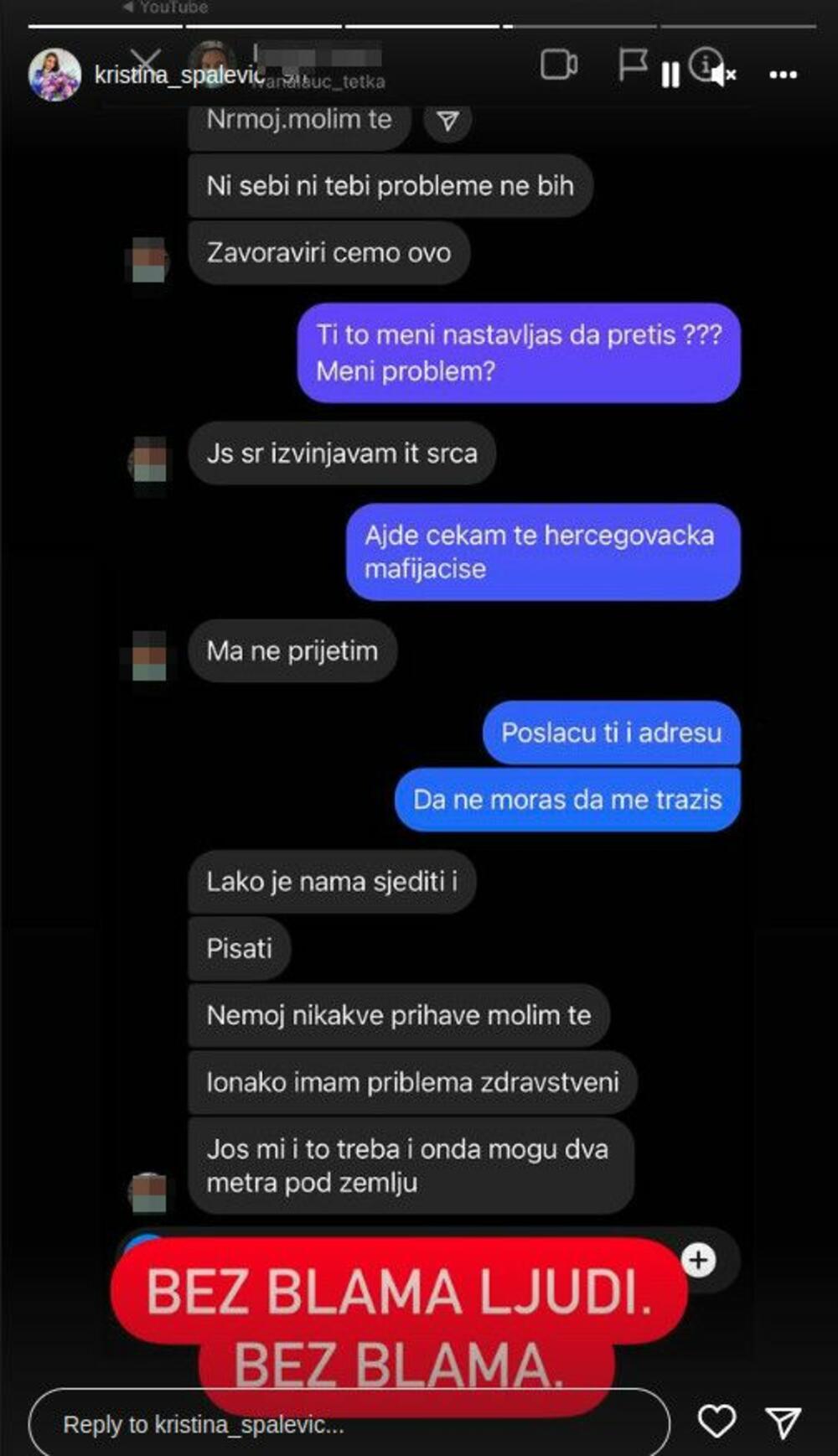 - Svakog, ali svakog ko mi bude slao bilo kakve preteće poruke, prijaviću istog dana. Nikada u životu nisam nikoga prva dirala, i to je opšte poznato. Nikoga nisam uvredila, a na mene se zakačila svaka budala - napisala je Kristina i objavila poruke jedne gospođe koje su bile uznemirujućeg sadržaja.