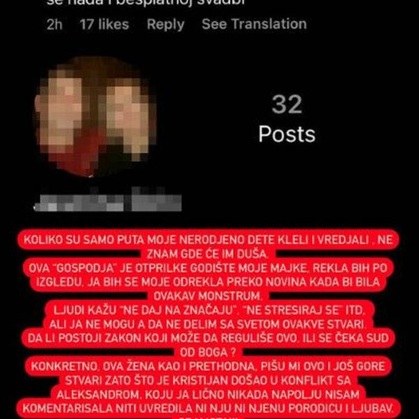 - Koliko su samo puta moje nerođeno dete kleli i vređali. Ne znam gde će im duša. Ova "gospođa" je otprilike godište moje majke. Ja bih se moje odrekla preko novina kada bi bila ovakav monstrum. Ljudi kažu "ne daj na značaju", "ne stresiraj se" itd. Ali ja ne mogu a da ne delim sa svetom ovakve stvari. Da li postoji zakon koji može da reguliše ovo ili se čeka sud od boga? Konkretno, ova žena kao i prethodna pišu mi ovo i još gore stvari zato što je Kristijan došao u konflikt sa Aleksandrom, koju ja lično nikada nisam komentarisala niti uvredila, ni nju, ni njenu porodicu, ni njenu ljubav. Sramota! Pored ovoga svakodnevno mi pišu da dete treba da mi umre. Žao mi je sine što dolaziš na ovakav svet, voli te mama najviše na svetu - napisala je Kristina, vidno potresena.