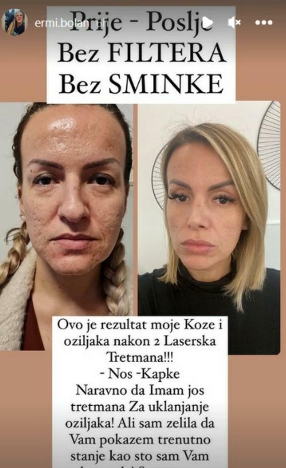 - Pre i posle. Bez filtera i bez šminke. Ovo je rezultat moje kože i ožiljaka nakon dva laserska tretmana. Nos, kapke, naravno da imam još tretmana za uklanjanje ožiljaka, ali sam želela da vam pokažem trenutno stanje, kao što sam obećala - poručila je na Instagramu nekadašnja zadrugarka.