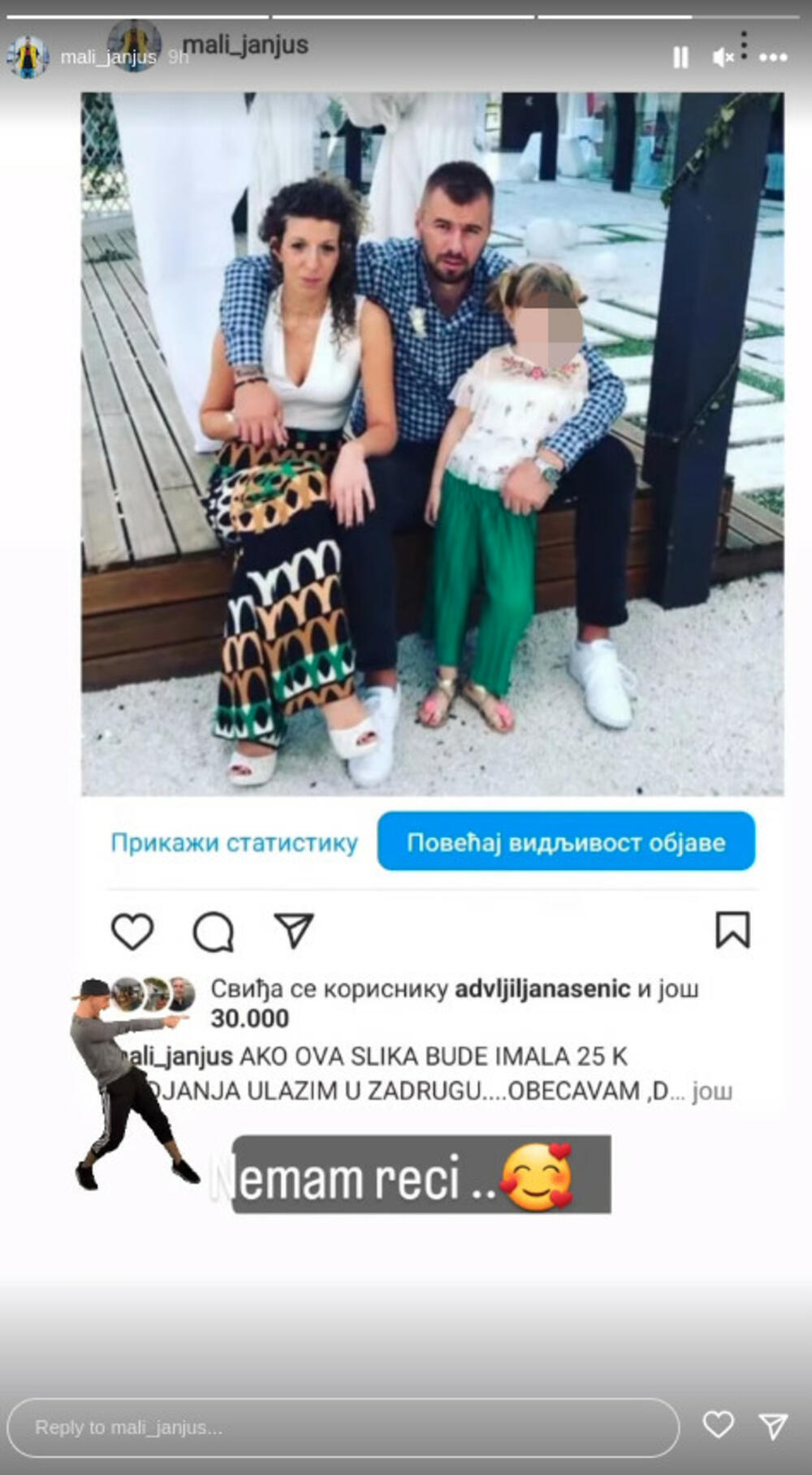 Marko Janjušević Janjuš je nedavno na svom Instagram profilu objavio da će ući u Zadrugu 6, ukoliko njegova fotografija, sa bivšom suprugom Enom Janjušević i ćerkom Krunom dobije 25.000 lajkova.