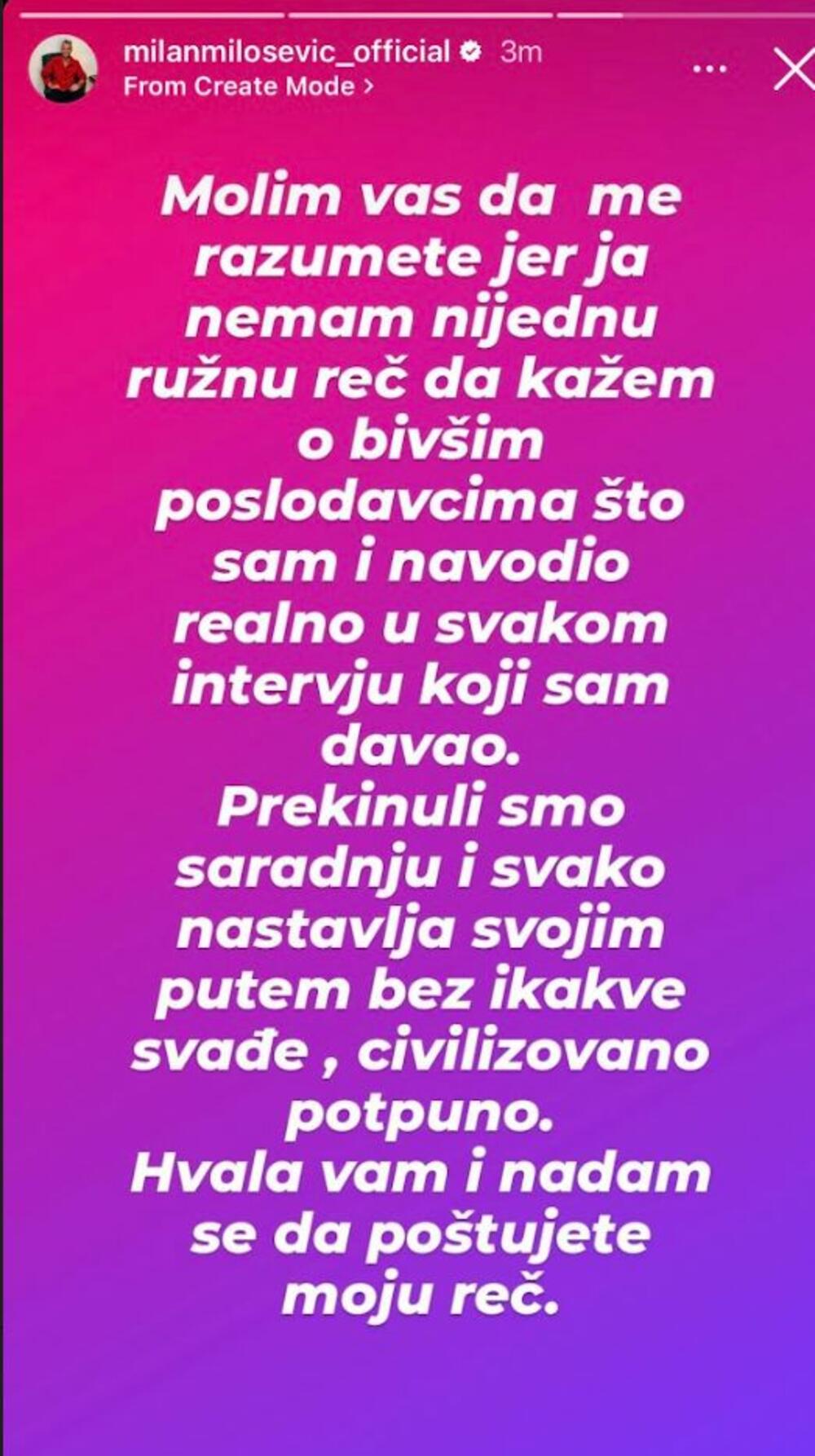 Naime, Milan se sada oglasio na svom Instagram profilu i otkrio zbog čega je došlo do prekida saradnje sa televizijom Pinkom.