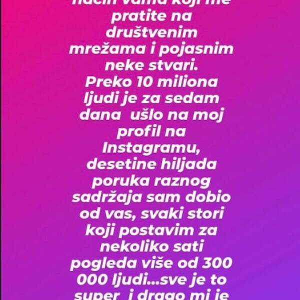 - Dobar dan svima! Želim po prvi put da se obratim na ovaj način vama koji me pratite na društvenim mrežama i pojasnim neke stvari. Preko 10 miliona ljudi je za sedam dana ušlo na moj profil na Instagramu, desetine hiljade poruka raznog sadržaja sam dobio od vas, svaki stori koji postavim za nekoliko sati pogleda više od 300.000 ljudi. Sve je to super, drago mi je što se toliko interstujete za mene ali moram neke stvari da vam objasnim - napisao je Milan, pa dodao: