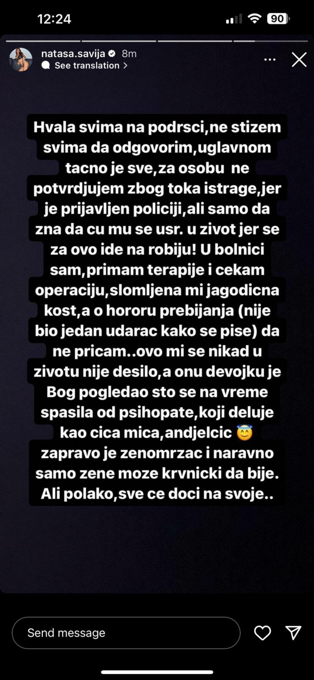 Nataša Šavija se trenutno nalazi na intenzivnoj nezi, odakle se oglasila i otkrila detalje incidenta koji se dogodio u Vrdničkoj kuli