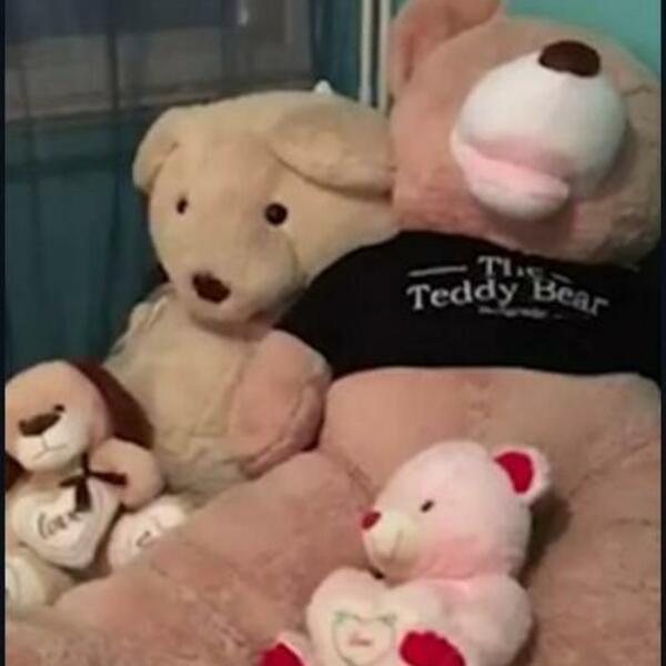 Na kravetu su plišane igračke, a celi stan je okrečen u crvenu boju